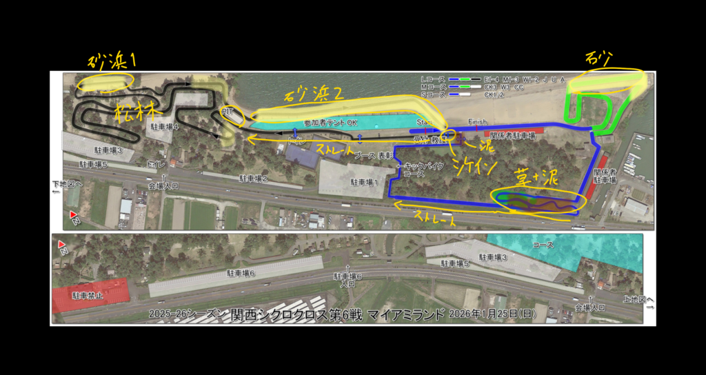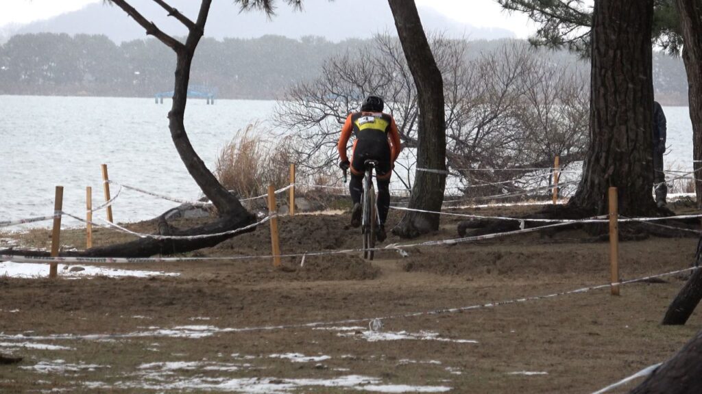 関西CX第9戦の会場は滋賀県野洲市のキャンプ場 ビワコマイアミランド。琵琶湖岸の長い砂浜をメインに、松林を縫う連続コーナー区間や、スピードの出る遊歩道を盛り込んだコースだ。