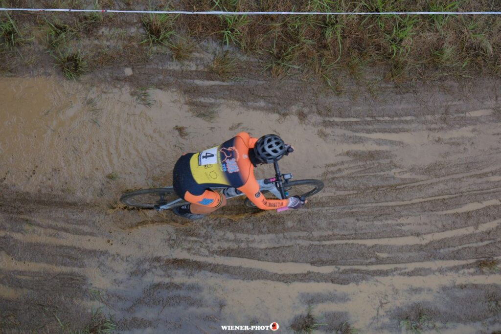 E1選手たちに踏み固められた路面はグリップが良くなってきており、ペダリングを止めずに踏み続けられる。