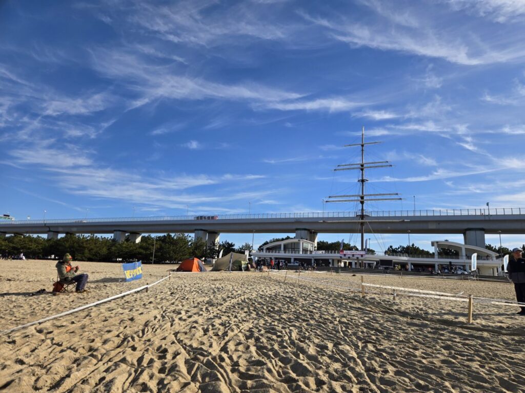 松林区間から高架下のストレートを抜け、砂浜エリアに降りる帆船マスト前では、一気に開けた視界に、海と砂浜と、コーステープを埋め尽くす観客が飛び込んできた。