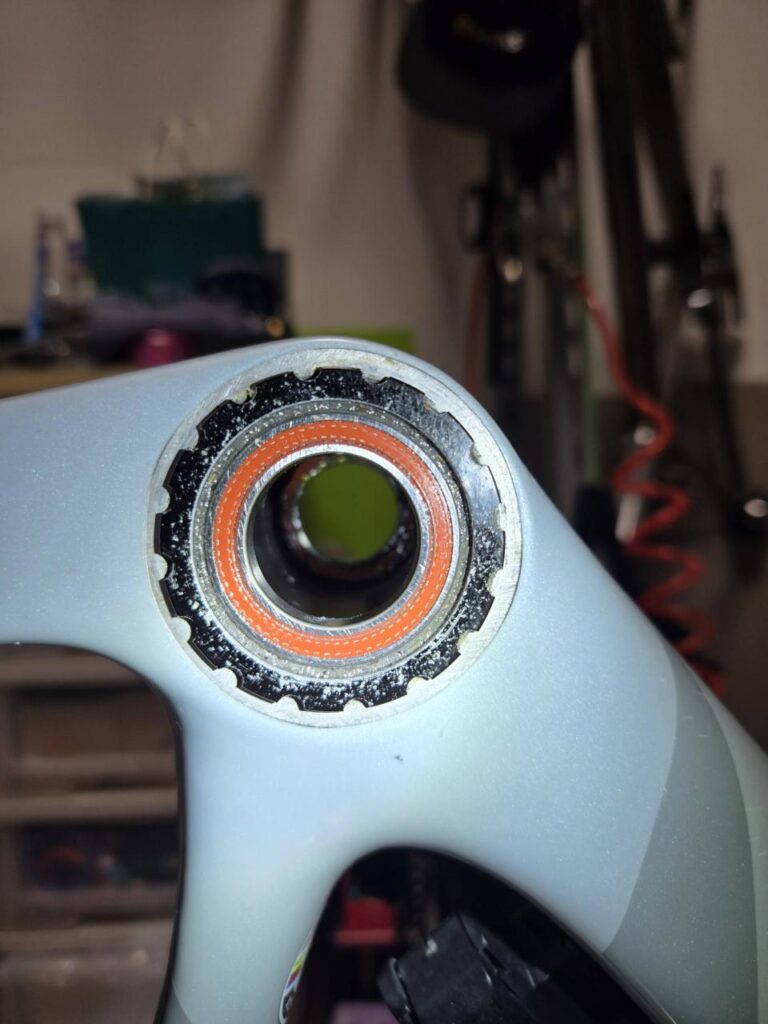 ボトムブラケットのベアリングもチェックしたが、こちらは目立った浸水もなく無事だった。